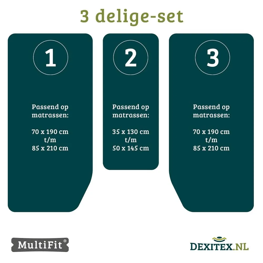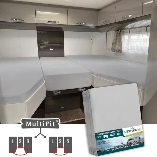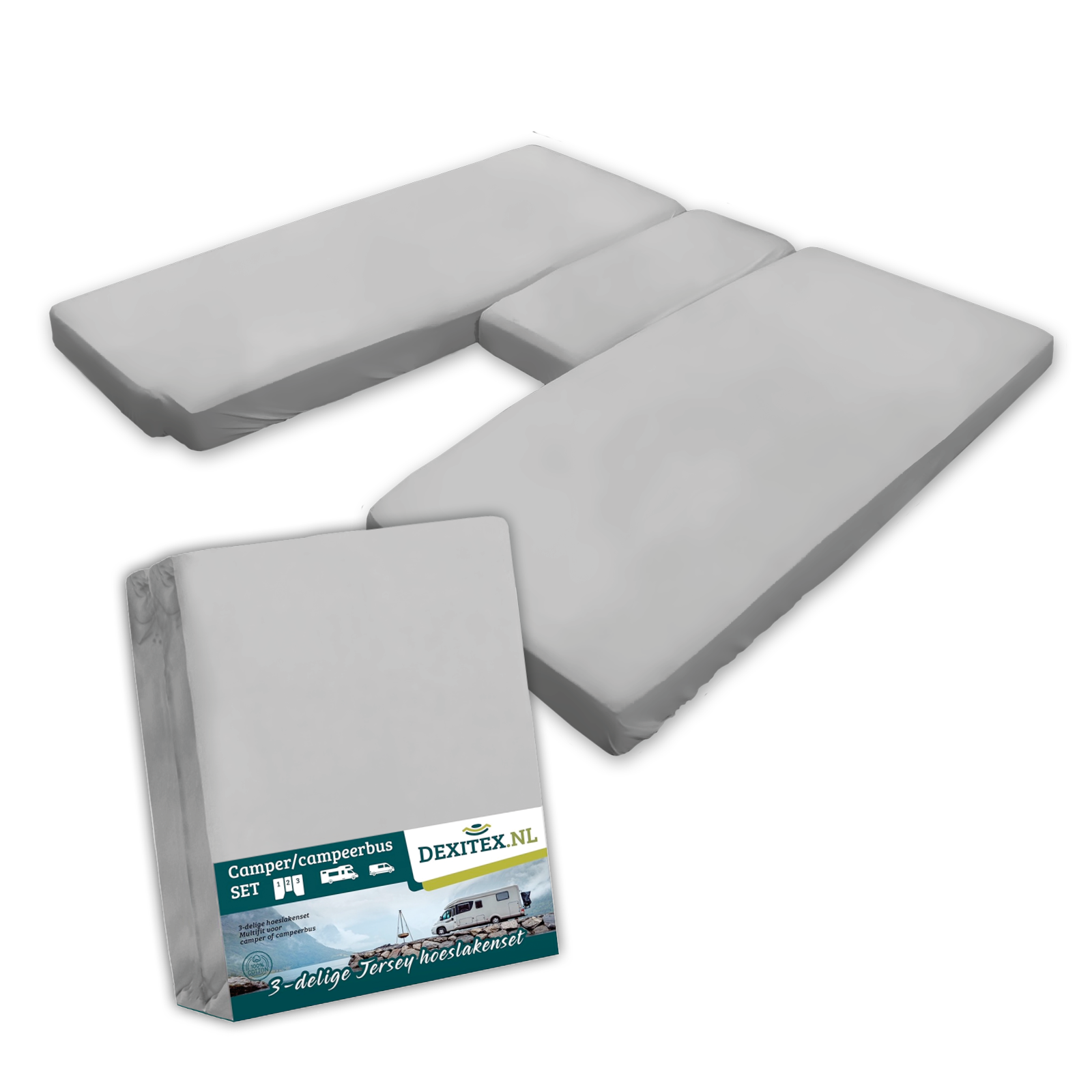 Deze set hoeslakens is speciaal ontwikkeld voor de 3 delige matrassen indeling in camper of caravan. De set bevat 3 jersey hoeslakens in extra dikke kwaliteit. Één voor het linker matras, één voor het rechter matras én een 1 speciaal op maat gemaakte voor het middenstuk. Zo zijn alle 3 de matrassen perfect en netjes opgemaakt.