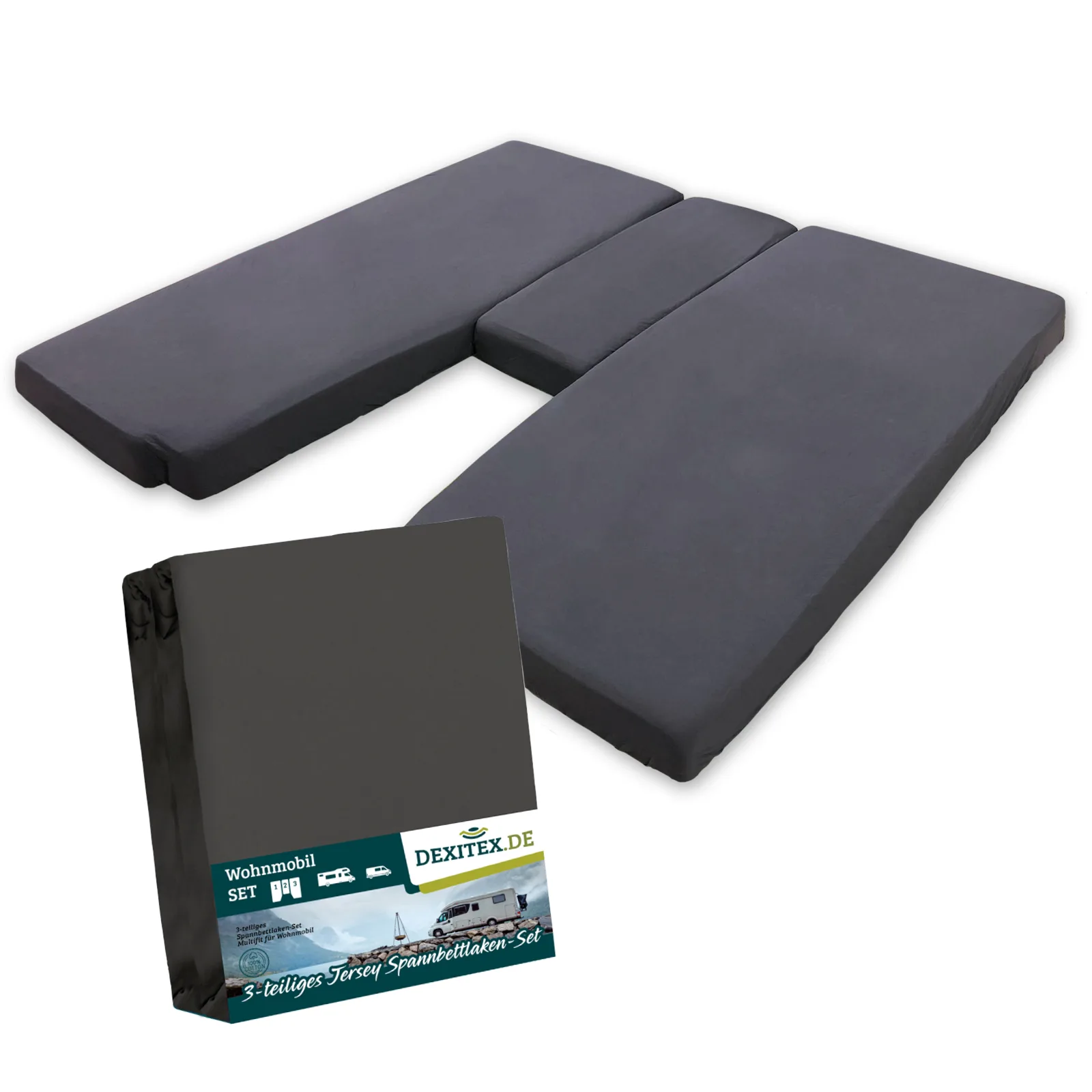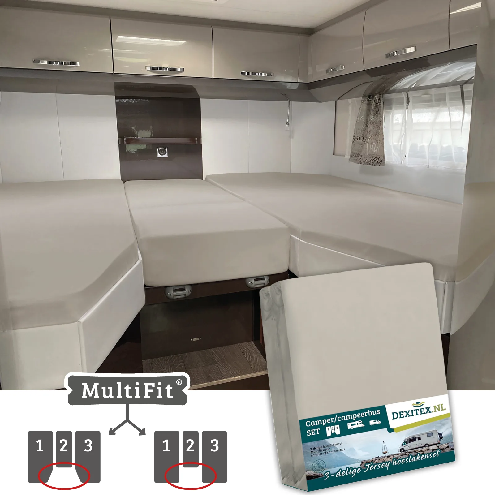 Complete 3 delige set hoeslakens speciaal voor caravan of camper indeling.